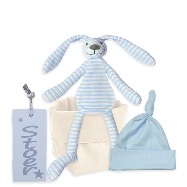 Een onwijs leuk cadeau voor een jongen! Dit kleurige cadeaupakket zit vol met prachtige presentjes: van versiering voor de babykamer tot een snoezige tuttel. Het mandje is namelijk gevuld met een stoere tag, een mooie konijn tuttel en een schattig blauw mutsje.
