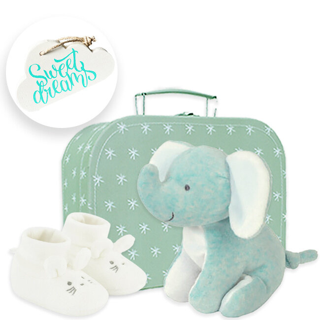 Een top cadeau voor iedere baby! Dit koffertje bevat allerlei cadeautjes die enorm leuk zijn om te ontvangen. Zo heeft dit pakket een uniek houten wolkje dat prachtig in een babykamer past. Daarbij zit er in dit koffertje ook een mooi paar konijnen slofjes en een schattig olifant knuffeltje! Samen maakt dit het een fantastisch kraamcadeau pakket om te geven.